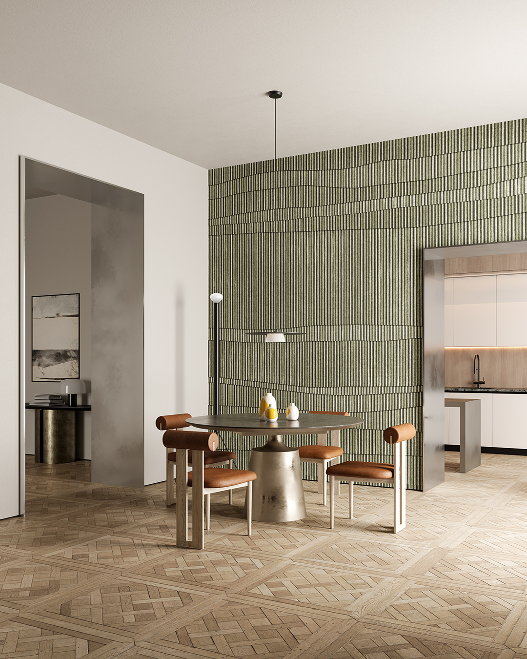 La superficie si sveste e si riveste, pattern e texture si sovrappongono e si alternano. Si sfogliano fino a spogliare la parete e si sovrappongo nella definizione di un’eleganza senza tempo fatta di tessuti pregiati, geometrie e decori floreali.