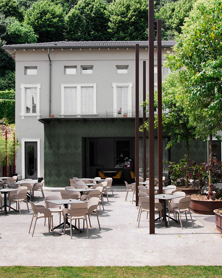 Alongside this technical requirement, the definition of the decoration was guided by an emotional component that touches the sphere of memories associated with the warmth and flavour that the dining room awakens in the memory. Inkiostro Bianco interpreted the request by researching period decorations and readapting them to the project. Starting from a classic decoration from the end of the 19th century, a reinterpretation of a brocade effect was created, bringing the retro style of old papers back to the present in a contemporary chromatic key in line with the palette identified for the project. The chromatic variants chosen for the two different areas of the restaurant area dialogue with the furnishings, which remain in the same colour scheme although on different materials.