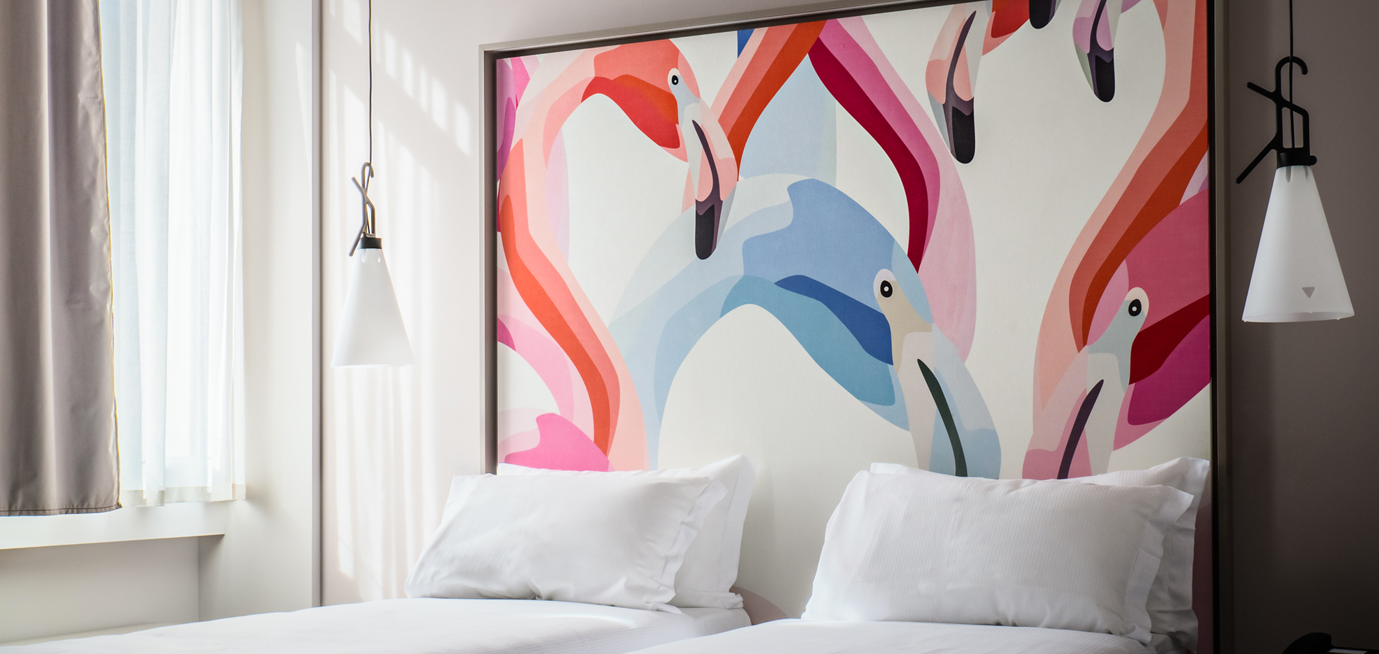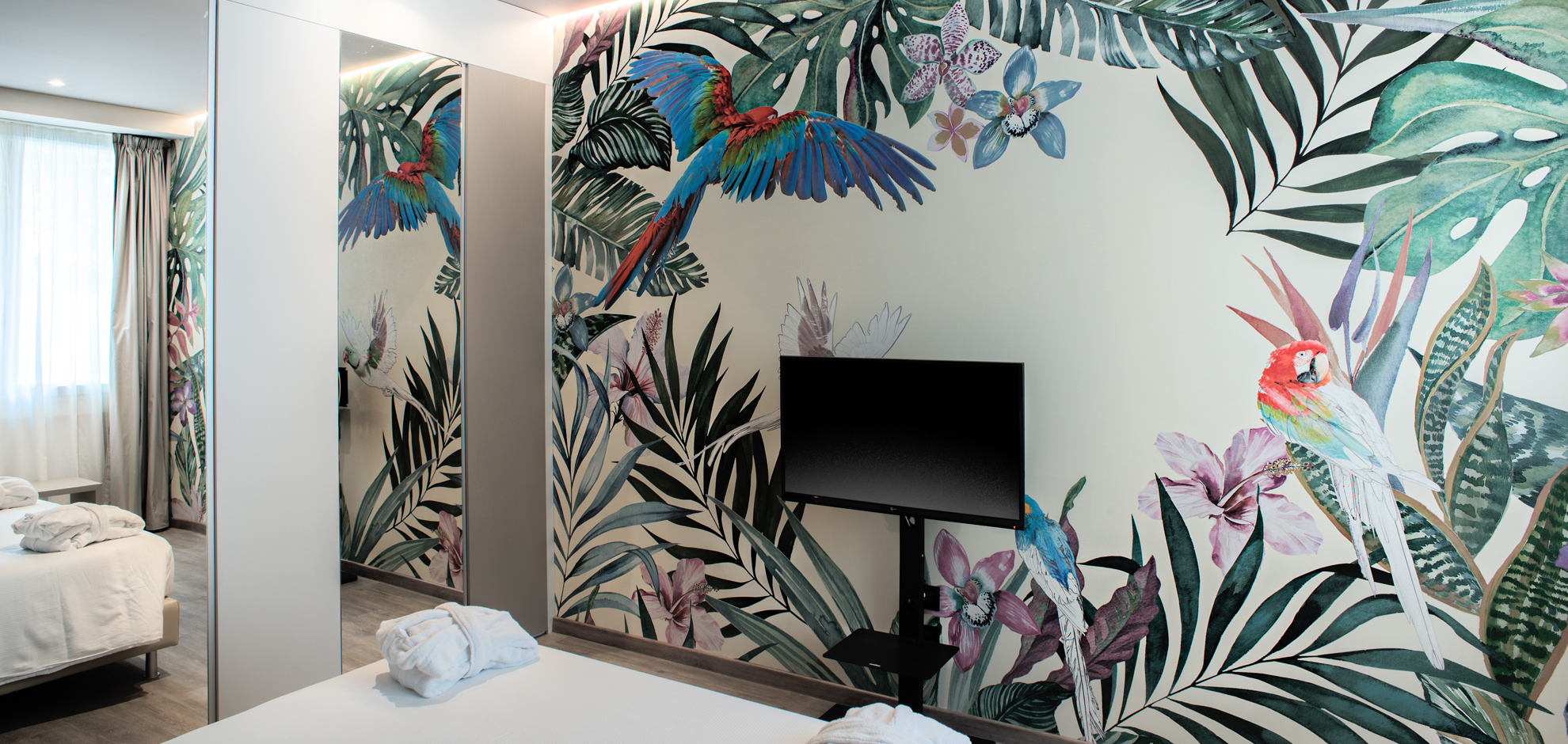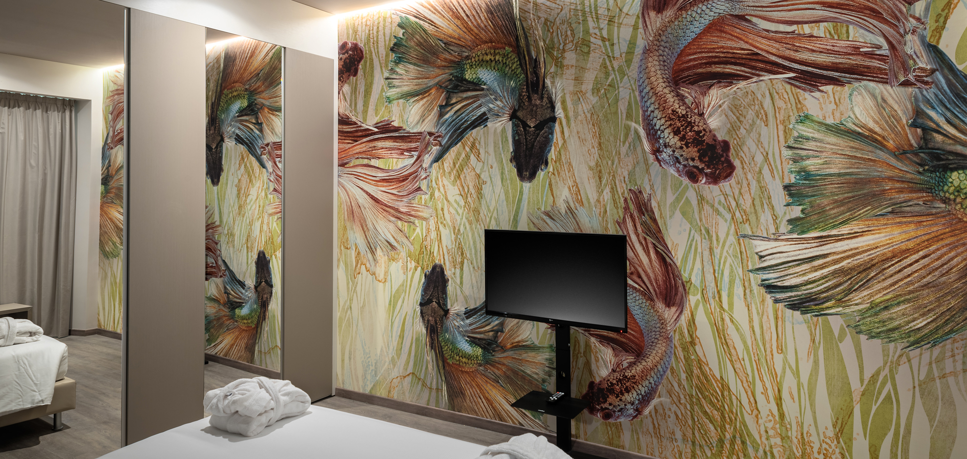 The materials chosen for this project perfectly match from a chromatic point of view, thus highlighting the striking decorations of the wallpapers, customised on each floor of the hotel according to the chosen theme. These are combined with the design lamps by Flos and Karman and the furniture by Moroso in a refined way.